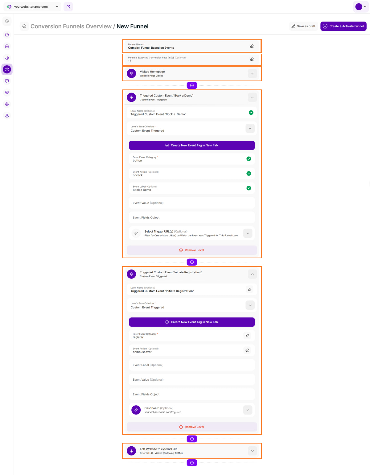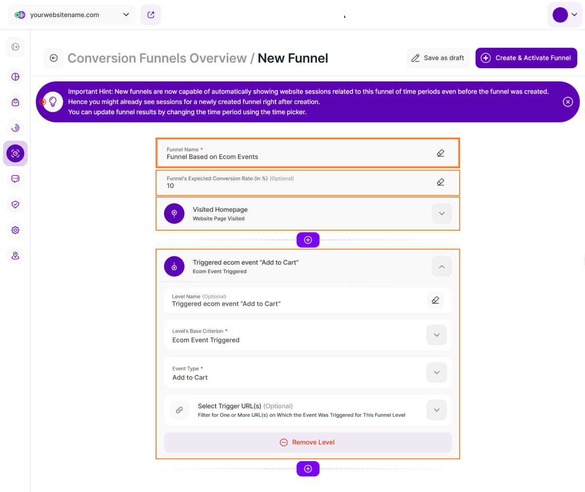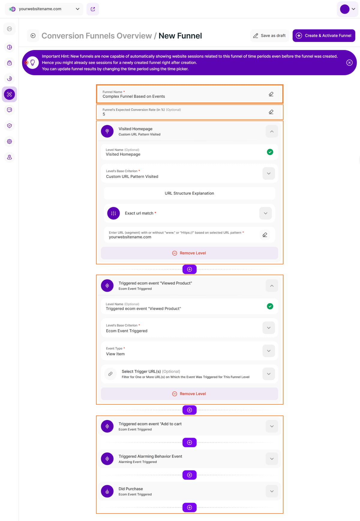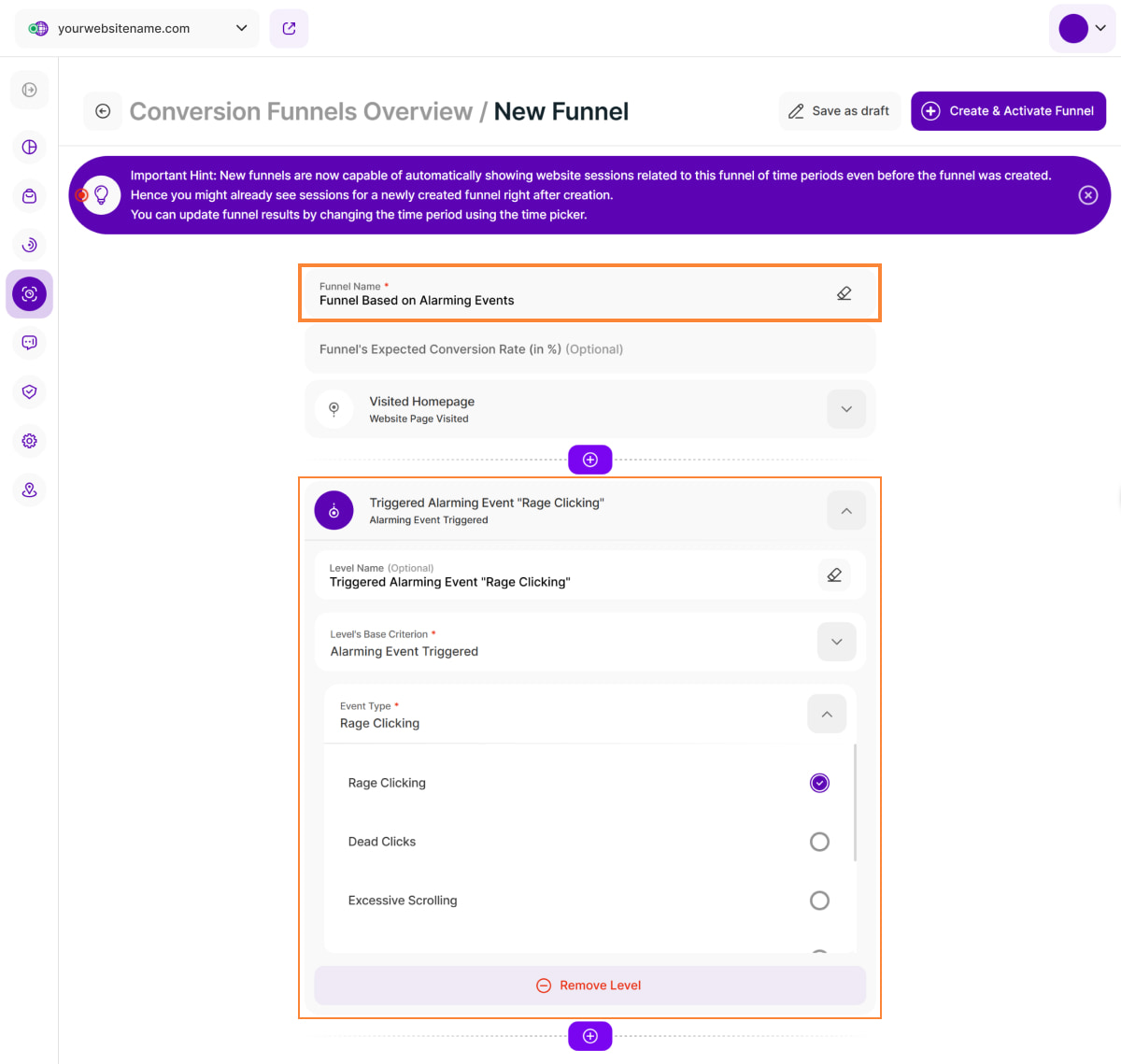 Setting a funnel level based on ABEs allows you to directly analyze how these alarming behaviors impact your website's conversion rates at specific stages of the visitor journey.