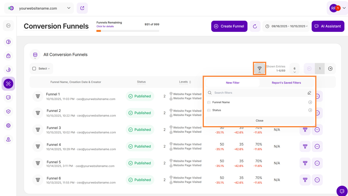 • Status: Displays the current status of each created funnel, if it's Published or Draft.