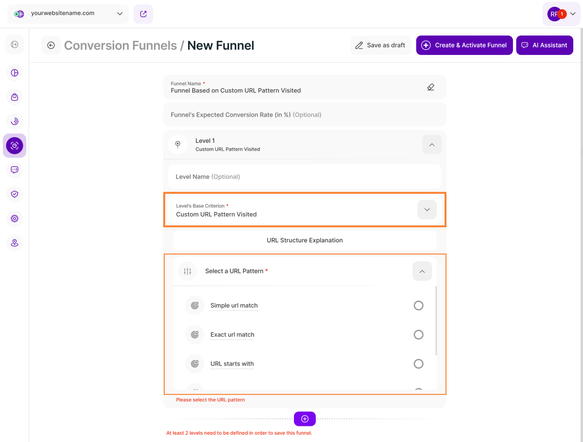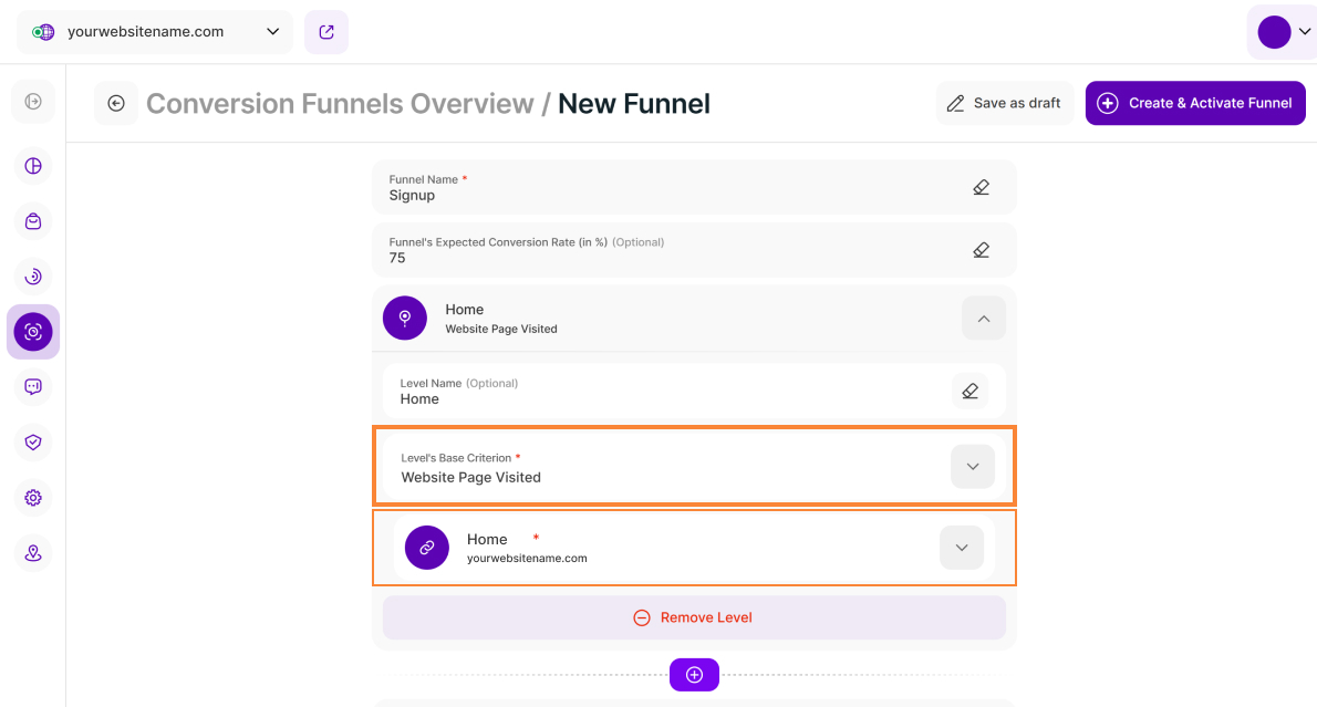 Note: You need to define at least two levels to save your funnel. For the subsequent level (Level 2), you can either choose Website Page Visited again or explore our other available base criteria.