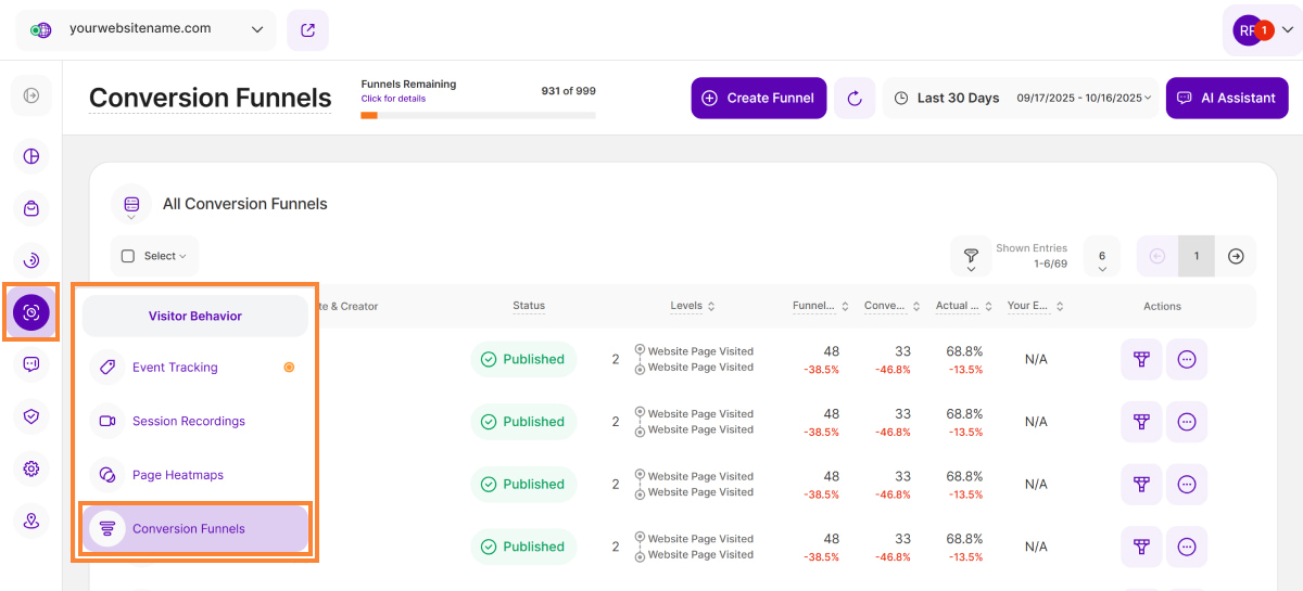• Published: Funnels that have been published and gathering data. Note that unlike heatmaps, there is NO possibility to pause the collection of data.