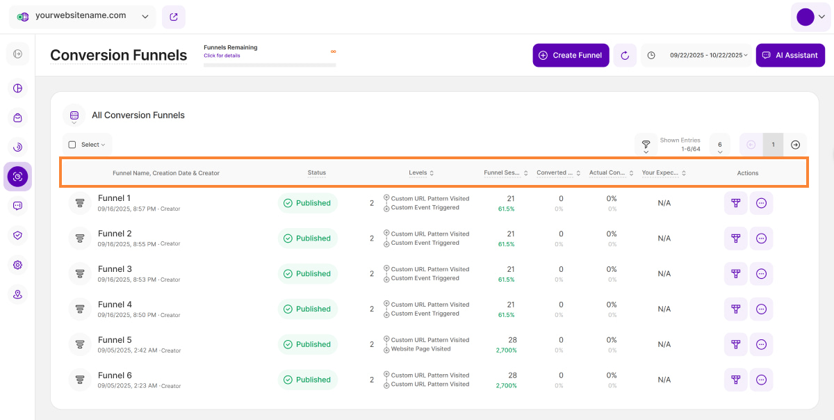 • Your Expected Conversion Rate: This column shows a funnel's expected conversion rate that you manually defined for a funnel during its setup. You can update the expected conversion rate anytime based on your needs.