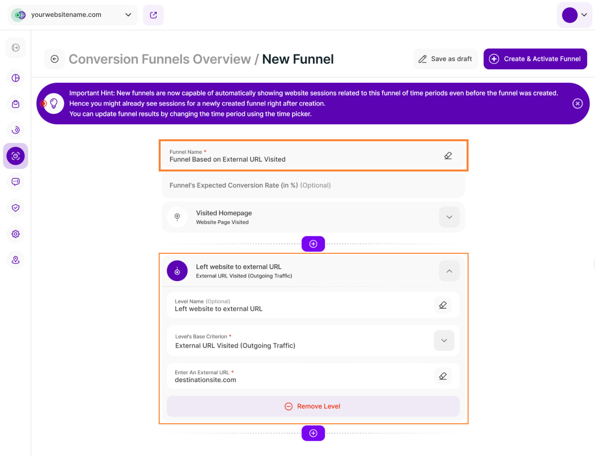 To provide a more comprehensive understanding of how your visitors' navigation to external sites correlates with your conversion metrics, we've introduced the External URL Visited (Outgoing Traffic) base criterion within Conversion Funnels. This builds upon our recently introduced Outgoing Traffic module, which gives you a general overview of how many visitors leave your website to explore other sites via links or new tabs.