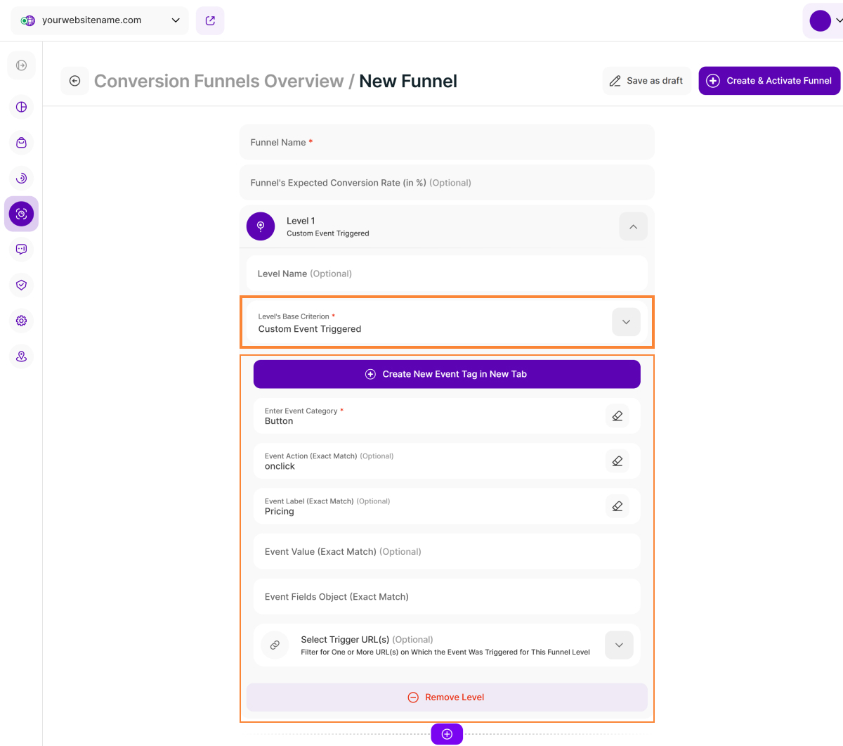 • Select Trigger URL(s) (Optional): While custom events track actions regardless of the page, you can optionally narrow down the scope of this funnel level to specific URLs where the event might occur.
