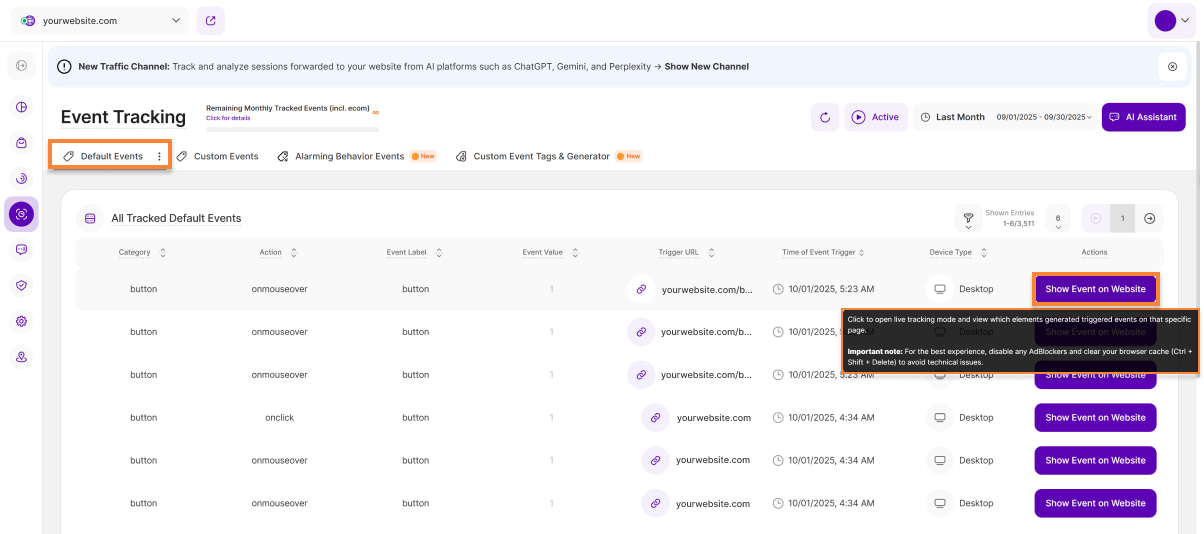 • Actions: This column lets you jump to where the auto-tracked event occurred on your website by clicking the Show Event on Website button. An overlay will also display additional stats about this and other events triggered on the same page. Learn more about it here: Auto-Tracking Previewer.
