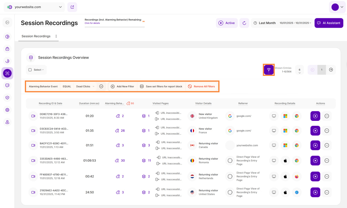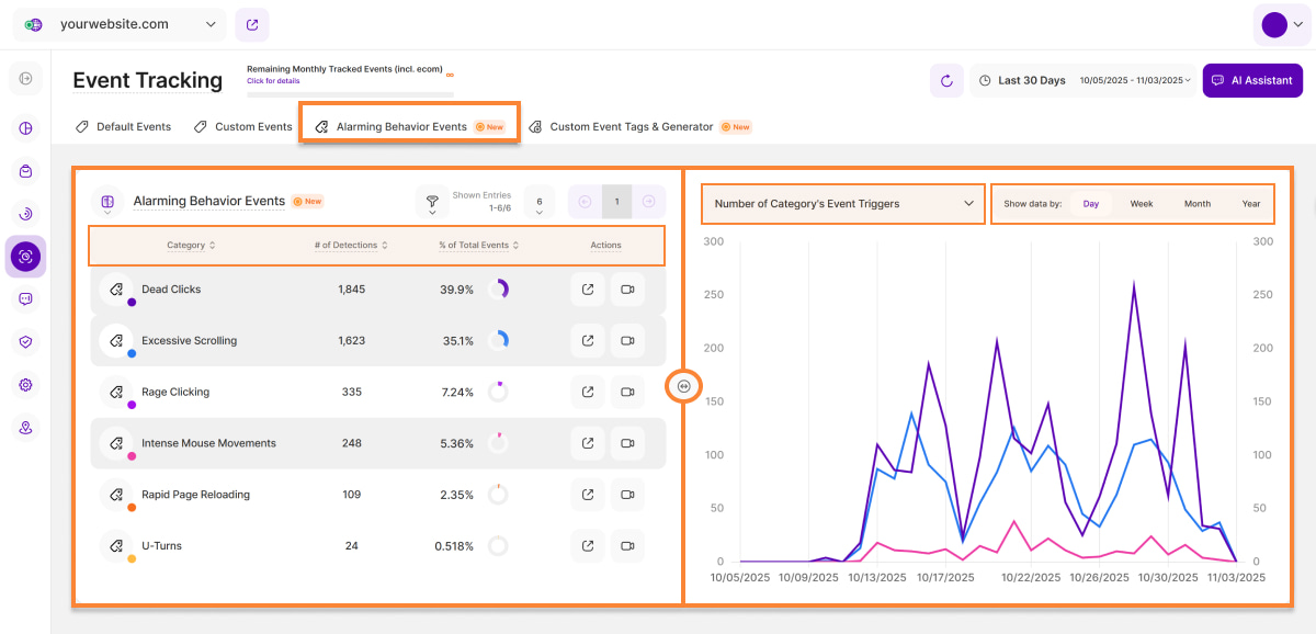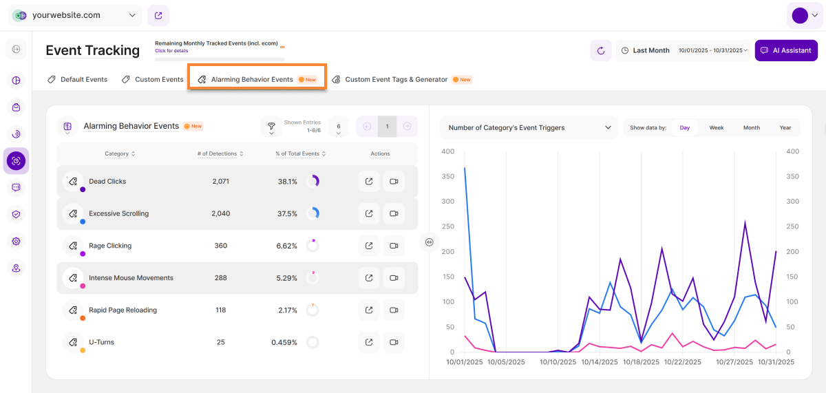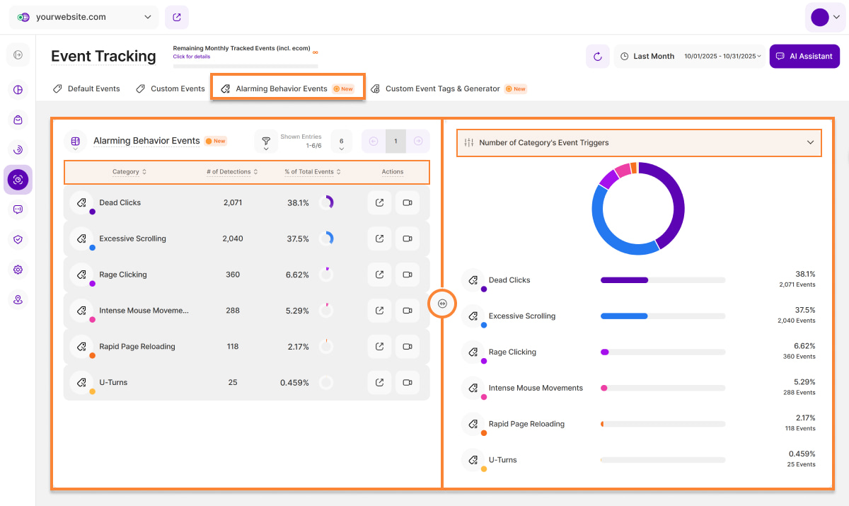 Here you find a list of all Alarming Behavior Event (ABE) categories that the platform is tracking. We are differentiating between 6 different categories being: Excessive Scrolling, Dead Clicks, Rage Clicking, Intense Mouse Movement, U-turns, and Rapid Page Reloads. All of those event categories can hint towards bad UX, technical bugs or lost conversions/revenue.