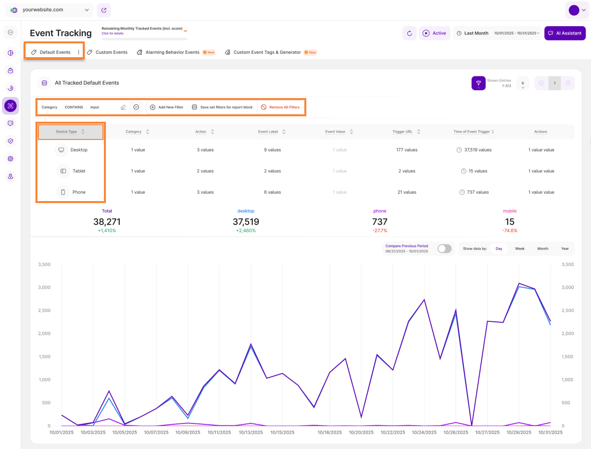 The Default Events tab provides a complete overview of every default event triggered by website visitors within the specific timeframe you selected. It is split into two insightful sections: