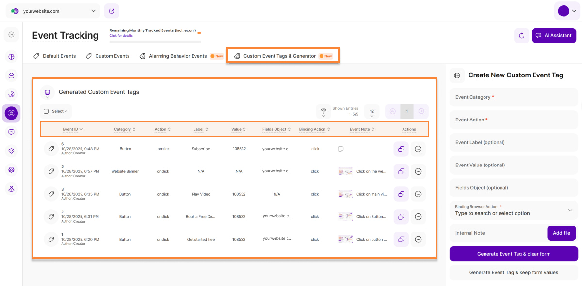 • Event Note: This column displays any notes that a contributor may have added to the custom event when creating it using the platform's custom event tag generator. This can help to better understand the context of a specific custom event (e.g., in teams).