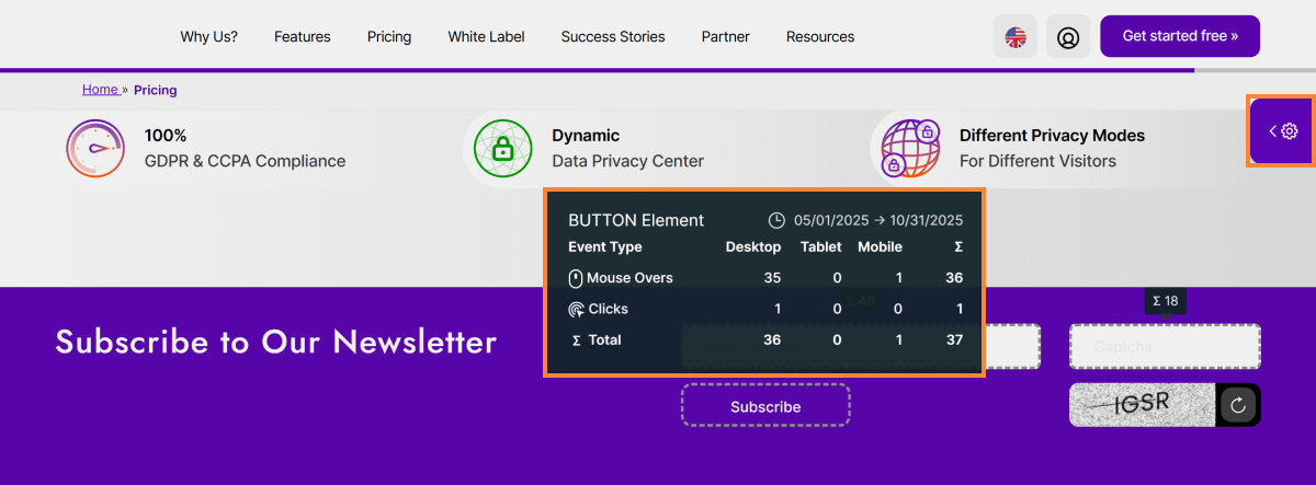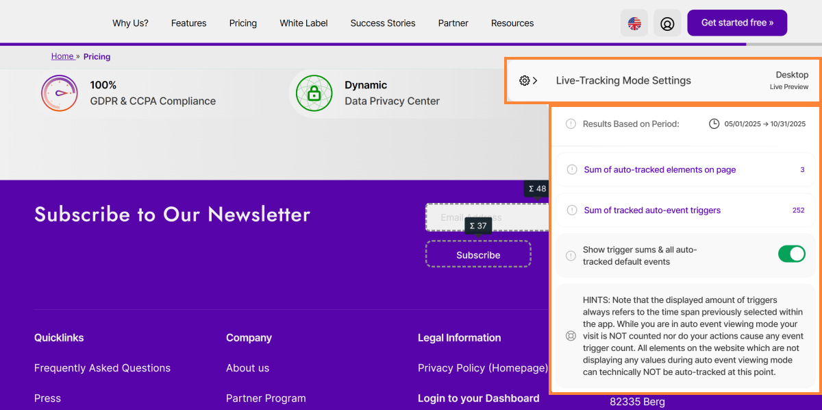 4. Show trigger sums & all auto-tracked default events: Activating this option will highlight all default elements which could be auto-detected by our system(only visible for you in this live tracking mode). Furthermore you will see a sum of all event triggers for each highlighted element in the selected period of time. Clicking on these trigger sums will provide you with more details about how this sum is generated.