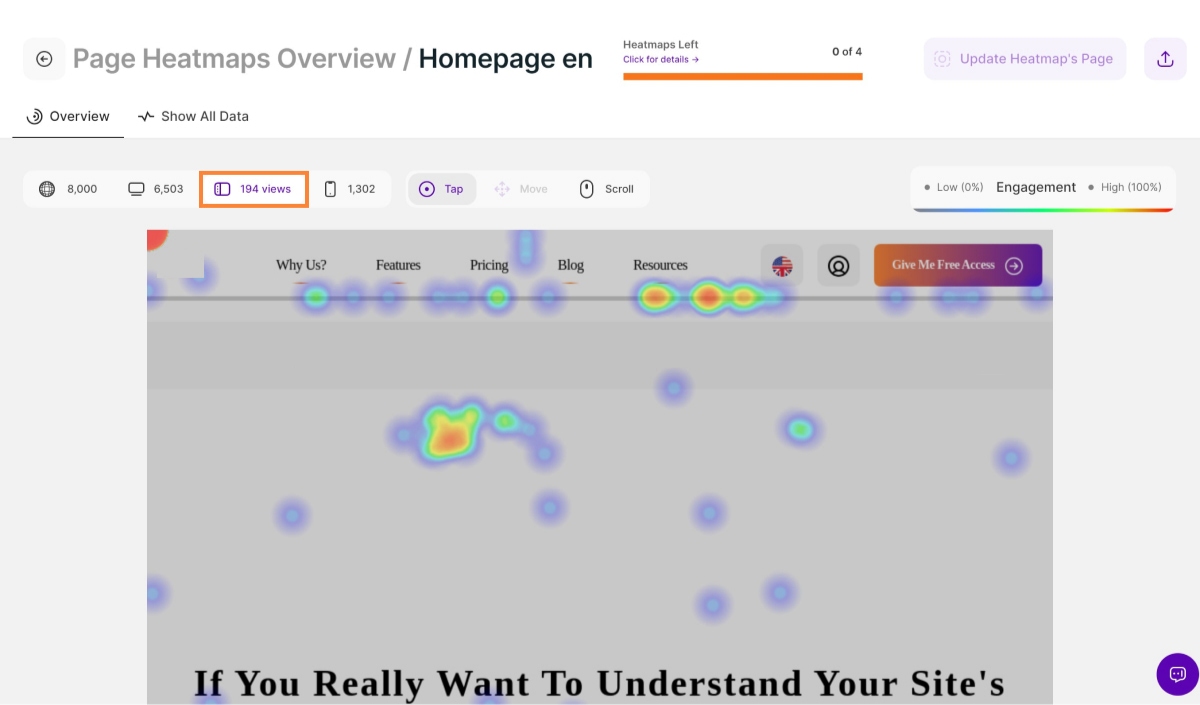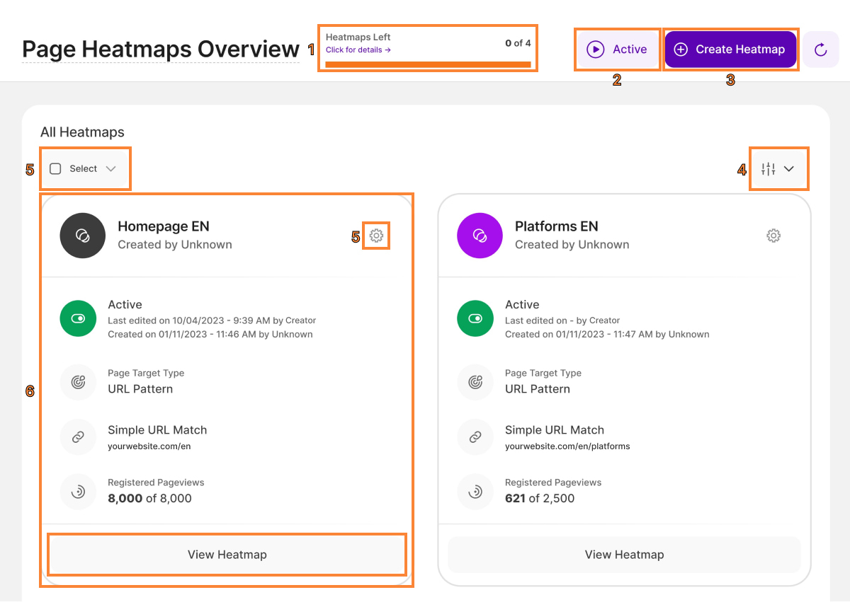 1. Feature Counter:See how many heatmaps you have left in your current plan. Hover over the counter for details about your subscription and upgrade options if needed.