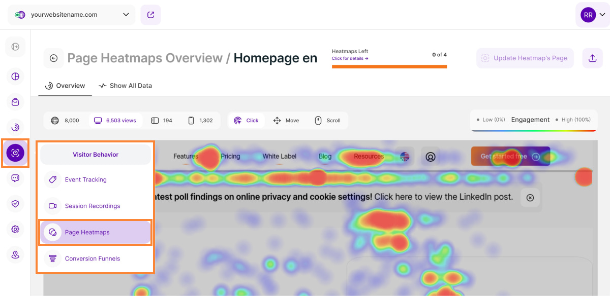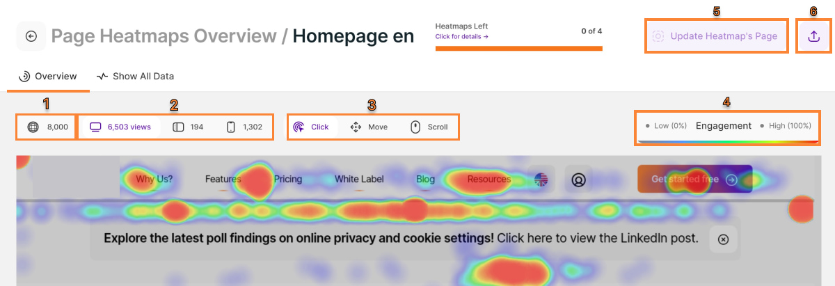 Now, let's explore the details of your heatmap. The Overview provides valuable insights into how visitors behave on your web pages. In this section, you’ll learn more about the different types of heatmaps, update heatmap’s screenshot, and many more.