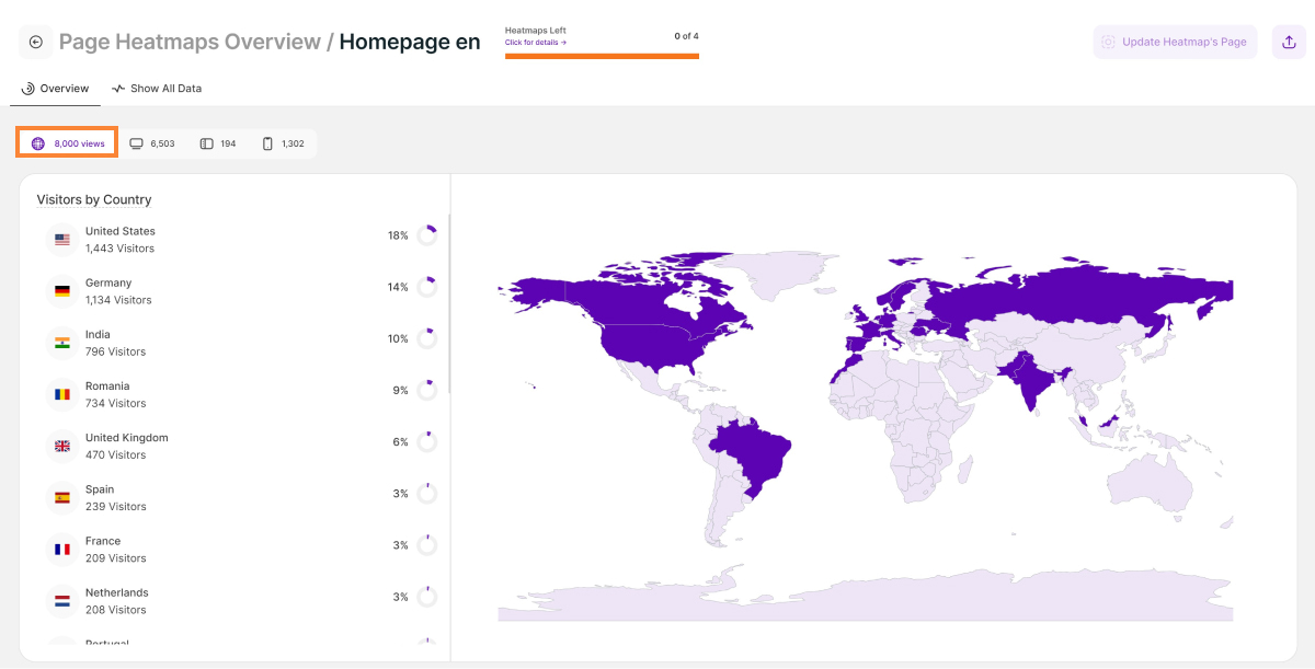 This section provides a visual overview of where visitors to your selected heatmap came from. It counts the page views based on origin. Quickly grasp which countries contribute the most visitors. Simply hover over specific map areas to see visitor numbers. Use your scroll or touchpad to zoom in on regions of interest.