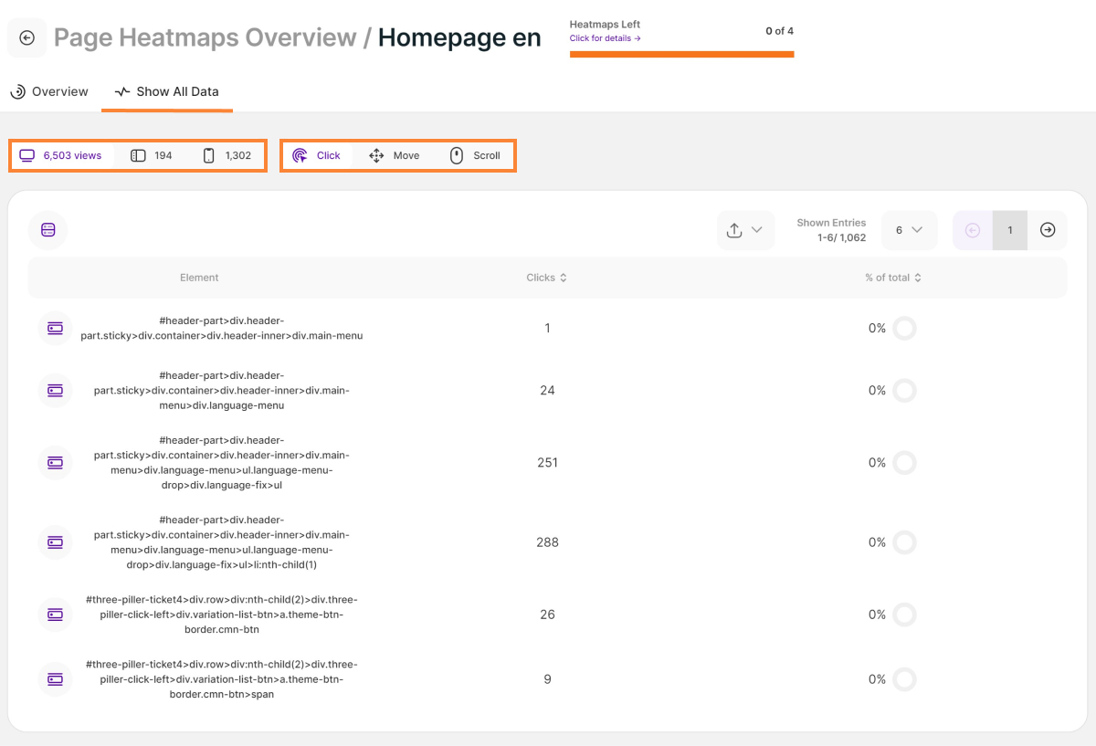 Now that you know the basics of heatmaps, let’s dive into analyzing the collected data. The Show All Data tab displays a table with the actual data generated. You may need more advanced technical knowledge to fully understand it and use it.