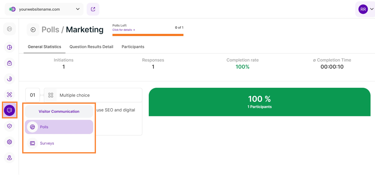 In general, the creation process of a poll and/or survey is identical. Also, the statistics and evaluations are the same. The main difference is that polls are being shown to your visitors directly integrated into your website, with the questions appearing in a little bubble while the surveys are presented to visitors or participants on a separate URL.