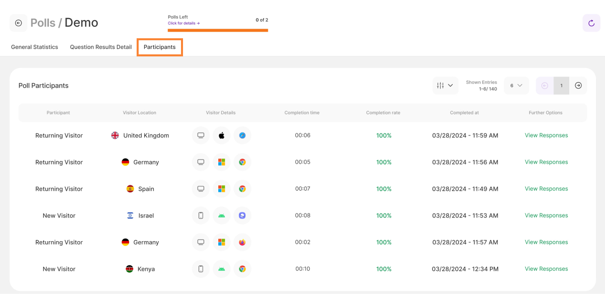 - Completion Rate: The ratio of participants that finished all questions of a poll/survey in comparison to the amount of people that replied to at least one question. Hint: You can also check each participant's completion rate individually within the participants table.
