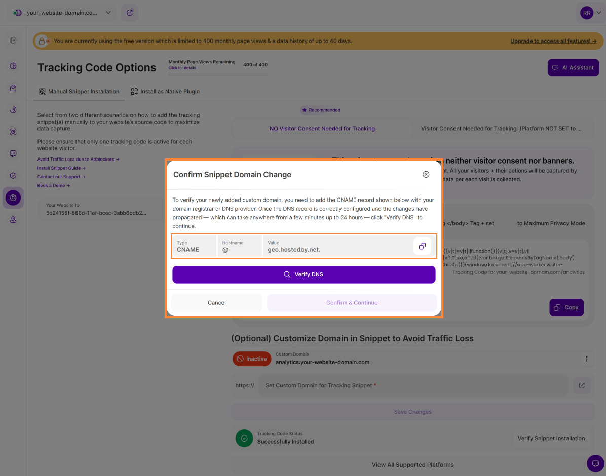 3. The Confirm Snippet Domain Change modal will appear with the required DNS details. To verify your newly added custom domain, you need to add the CNAME record (details below) displayed on the modal with your domain registrar or DNS provider: