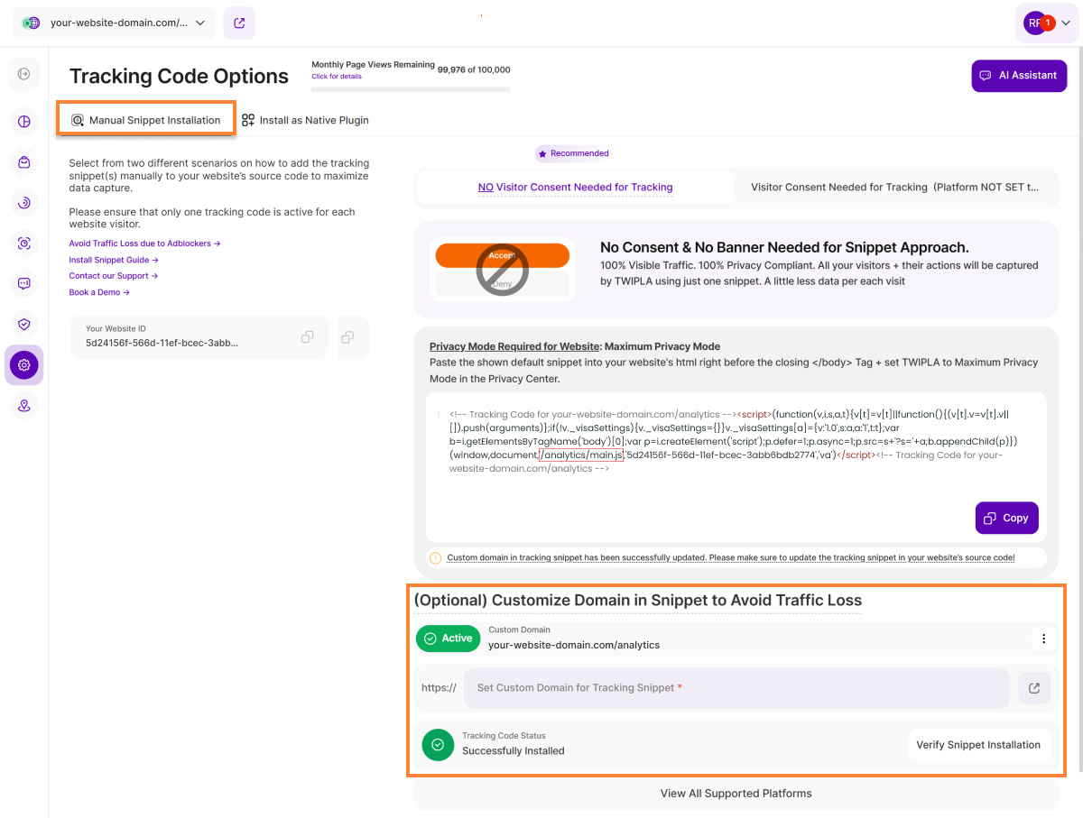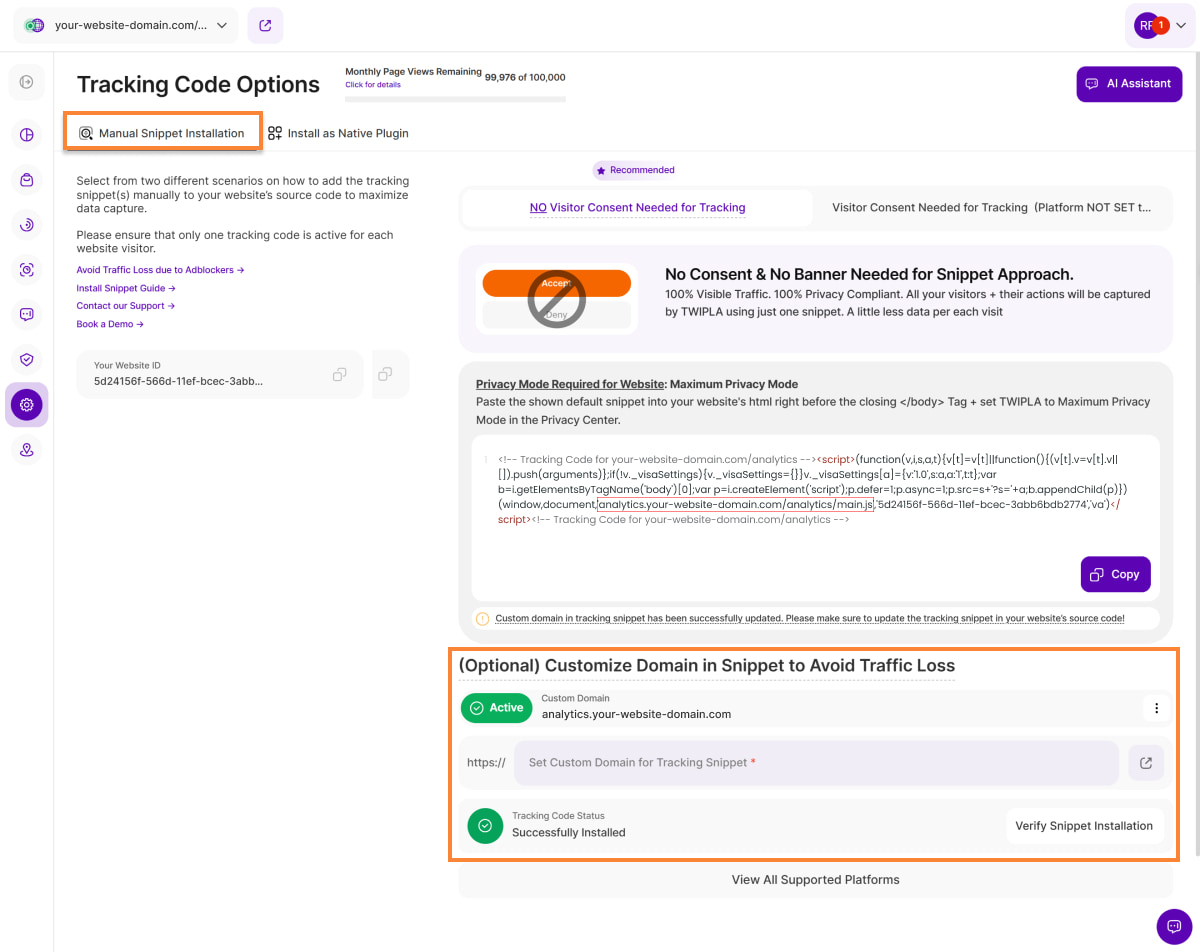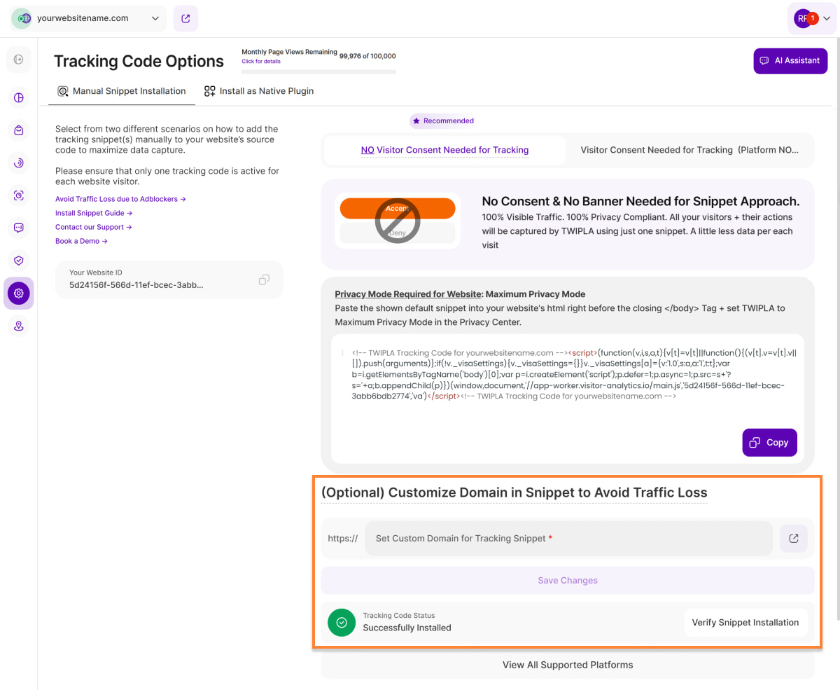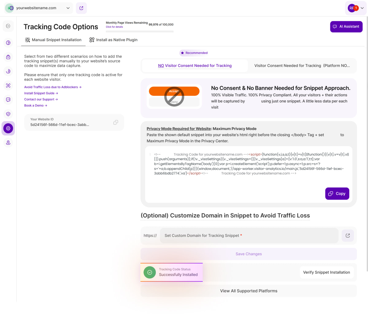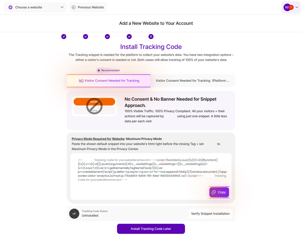 After selecting the data privacy mode for your website, choose between two tracking code options: [NO Visitor Consent Needed for Tracking(Recommended)] or [Visitor Consent Needed for Tracking