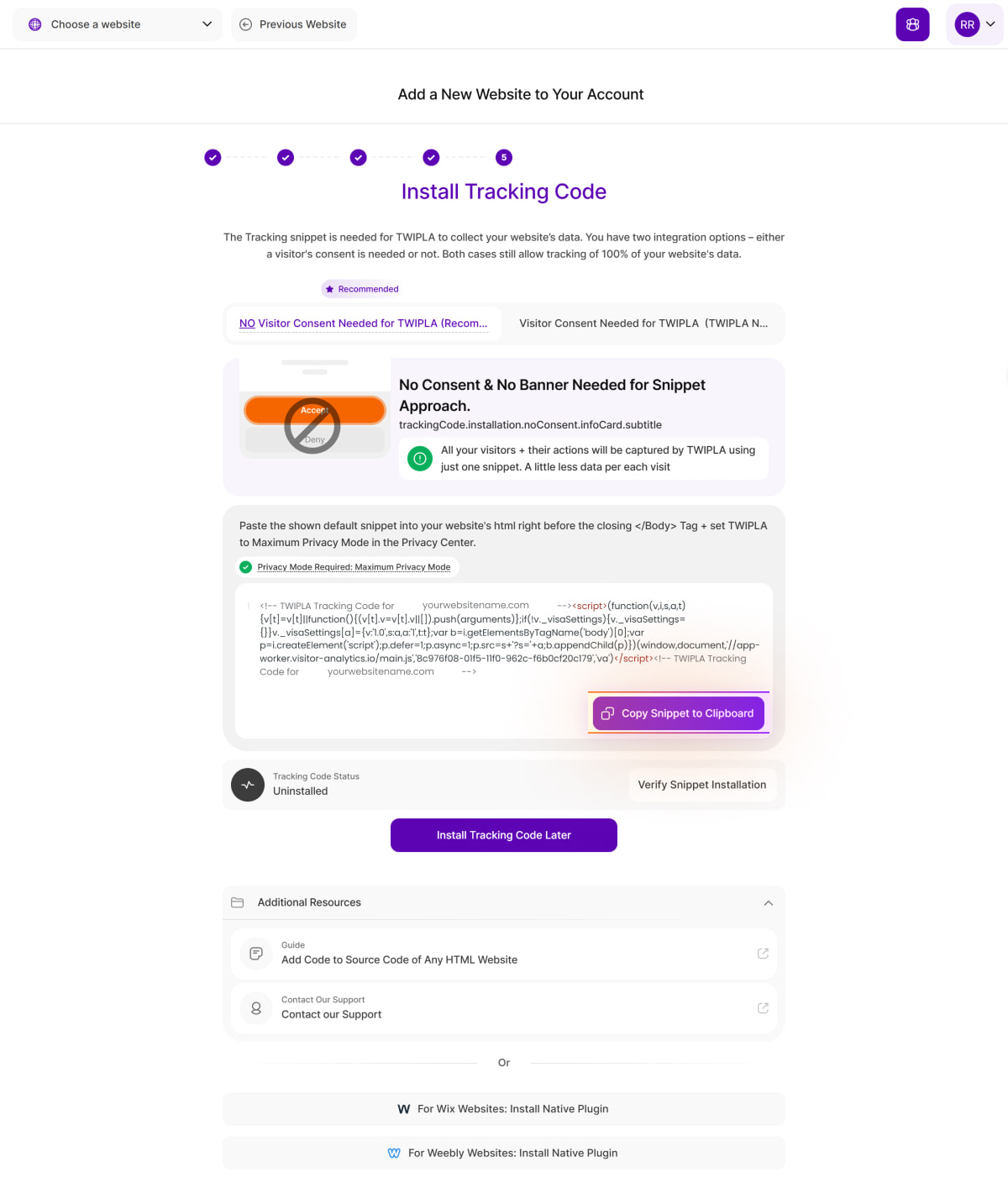 6. TWIPLA requires a tracking snippet to collect data from your website. Choose between two integration methods: one integration method allows you to collect data without visitor consent. The other method requires visitor consent. Both methods collect 100% of your website data. Copy the desired tracking code and paste it before the final '</body>'-Tag of your website's source code. Don't forget to publish the changes. You can find further information on installing tracking codes here.