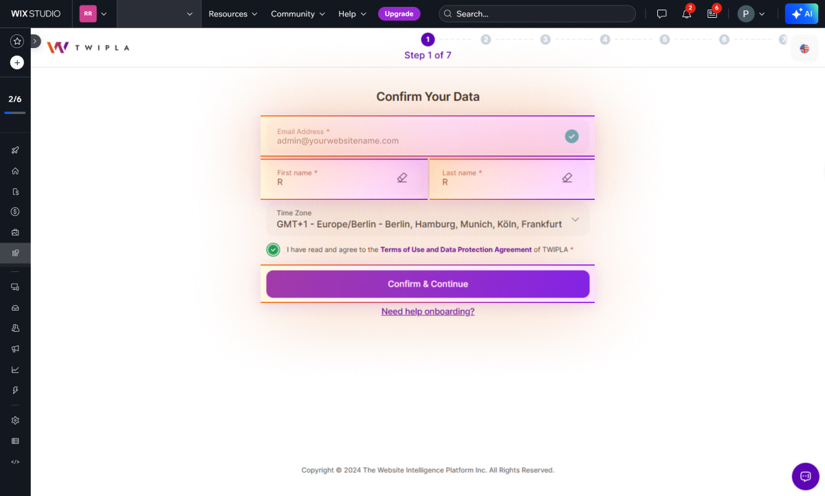6. Veți fi redirecționat către ecranul de onboarding pentru a vă confirma detaliile și a vă configura contul. E-mailul contului dvs. Wix va fi utilizat automat și nu poate fi schimbat.Introduceți numele și prenumele dvs. și selectați fusul orar. Bifați căsuța pentru a fi de acord cu Termenii de utilizare și Acordul privind protecția datelor și apoi faceți clic pe Confirmare & Continuare.
