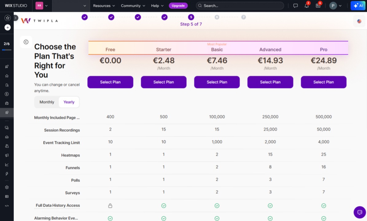10. Alegeți planul care se potrivește cel mai bine nevoilor dvs., în funcție de caracteristici precum vizualizările lunare ale paginilor și înregistrările sesiunilor. Puteți alege planul nostru gratuit sau puteți opta pentru planul Starter la 2,99 $ pe lună pentru a obține acces complet la suita noastră de analize.